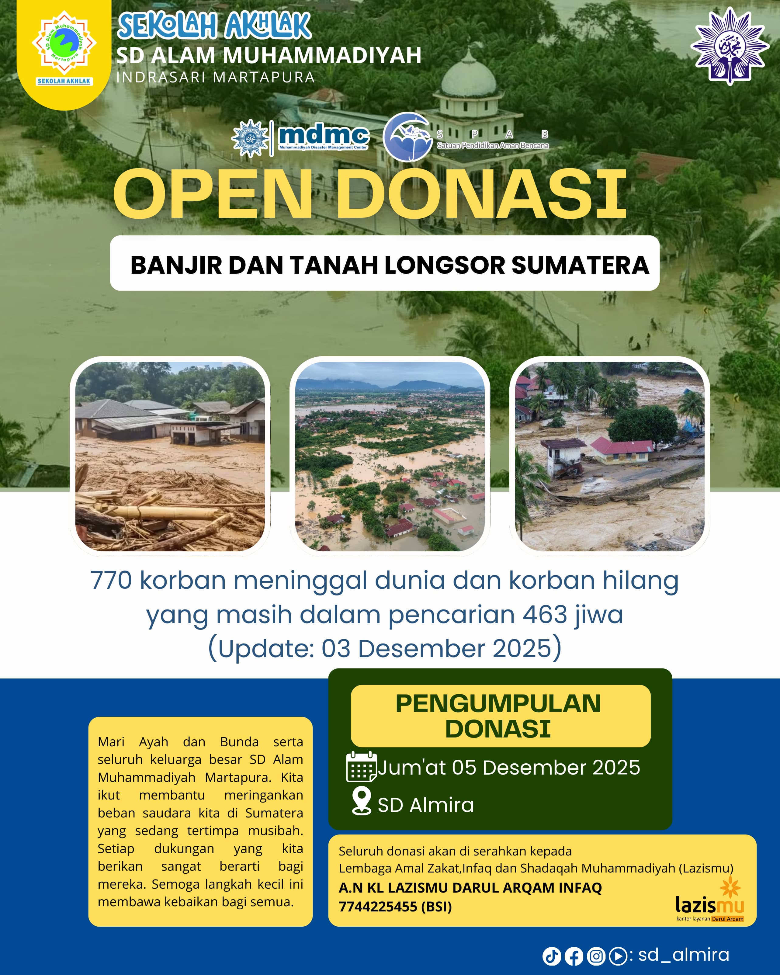 <h2>📢 <strong>OPEN DONASI: Bencana Banjir dan Tanah Longsor Sumatera</strong> 📢</h2><p>Keluarga besar <strong>SD Alam Muhammadiyah Indrasari Martapura</strong> mengajak Ayah dan Bunda serta seluruh warga sekolah untuk bersama-sama menunjukkan kepedulian dan solidaritas.</p><p>Saudara-saudara kita di Sumatera saat ini sedang tertimpa musibah dahsyat. Berdasarkan update 03 Desember 2025, tercatat <strong>770 korban meninggal dunia dan 463 jiwa masih dalam pencarian</strong>.</p><p>Mari kita ringankan beban mereka! Setiap dukungan yang kita berikan, sekecil apa pun, akan sangat berarti bagi para korban yang terdampak. Semoga kebaikan ini membawa keberkahan bagi kita semua.</p><h3>🗓️ <strong>Pengumpulan Donasi</strong></h3><ul><li><strong>Tanggal:</strong> Jum'at, 05 Desember 2025</li><li><strong>Tempat:</strong> SD Almira</li></ul><h3>🏦 <strong>Salurkan Donasi Melalui Rekening Resmi</strong></h3><p>Seluruh donasi akan diserahkan kepada Lembaga Amil Zakat, Infaq dan Shadaqah Muhammadiyah (Lazismu) melalui:</p><ul><li><strong>A.N:</strong> LAZISMU DARUL ARQAM INFAQ</li><li><strong>Nomor Rekening (BSI):</strong> 7744225455</li></ul><p>Mari wujudkan nilai <strong>Akhlak</strong> dengan menolong sesama. Ulurkan tangan, ringankan beban!</p>